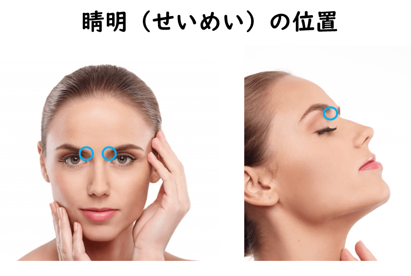 目の疲労回復には、眉の生え際にある「睛明(せいめい)」と、眉の真ん中にある「魚腰(ぎょこう)」というツボを押すのがオススメです。