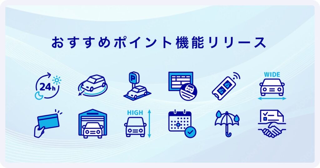 「おすすめポイント」を新設しました。各物件ページで、〔24時間利用可能/車庫証明取得可能/月途中からでも入庫可能/法人契約可能〕などの条件を、アイコン付きでひと目で確認できます。ポイントはクリックすると詳細説明が開き、初めての方でも迷わず条件を理解できます。